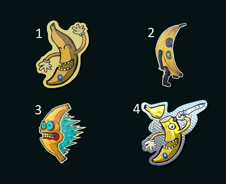 В CS куча наклеек с бананами, причем с необычными названиями. Вот вы сможете угадать, как называется каждый из представленных ниже стикеров? Ловите 4 названия и распределяйте их, а результаты пишите в комменты:
