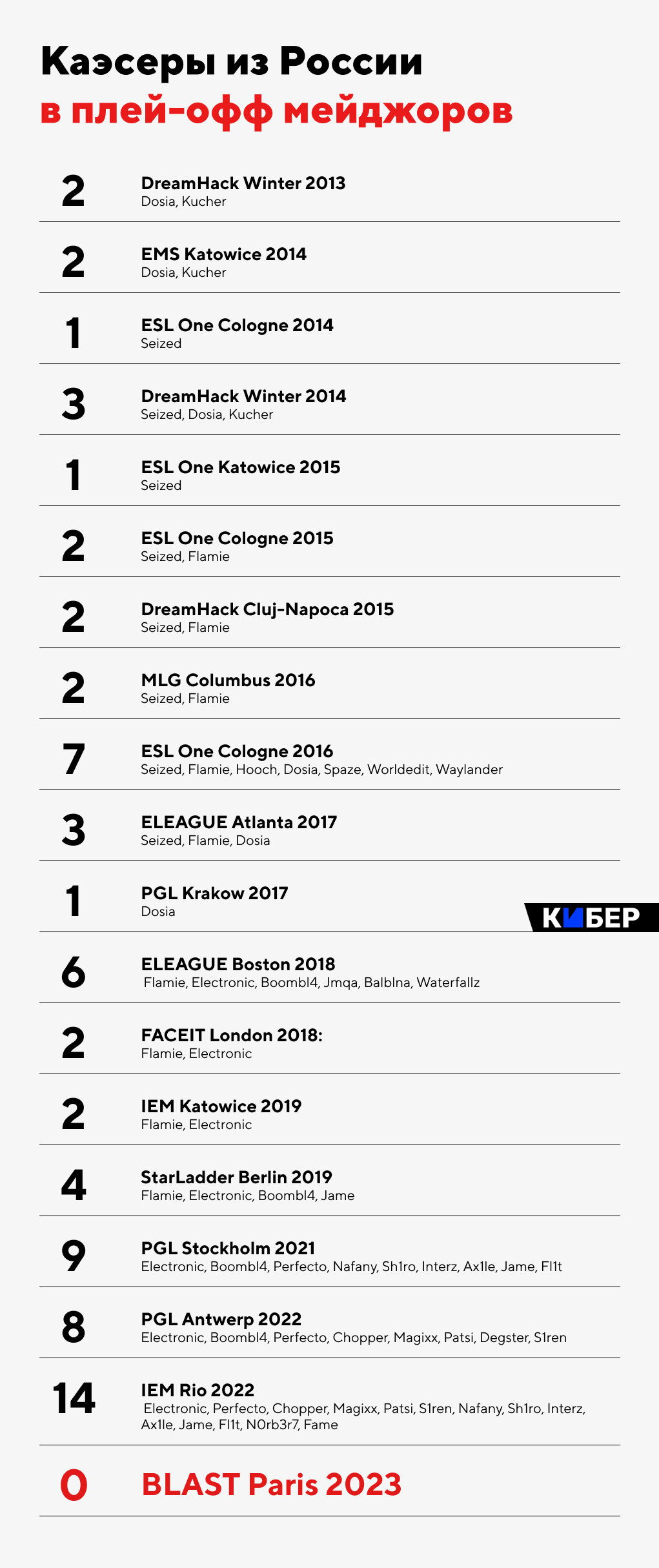 А вот – более подробная информация по всем российским каэсерам, которые когда-либо выходили в плей-офф. Обидно, что напротив парижского мейджора нет ников M0nesy, Perfecto и Zorte.