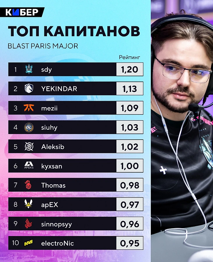 • Sdy – лучший капитан турнира. У него огромный отрыв от Екиндара, идущего вторым, – 1,20 против 1,13. В Monte Виктор играет намного лучше, чем в NAVI, а в стадии «Легенд» он даже обошел Бороса, которого считали самым сильным в составе. У Мухаммеда лишь 1,08 – 24-е место в общем рейтинге.