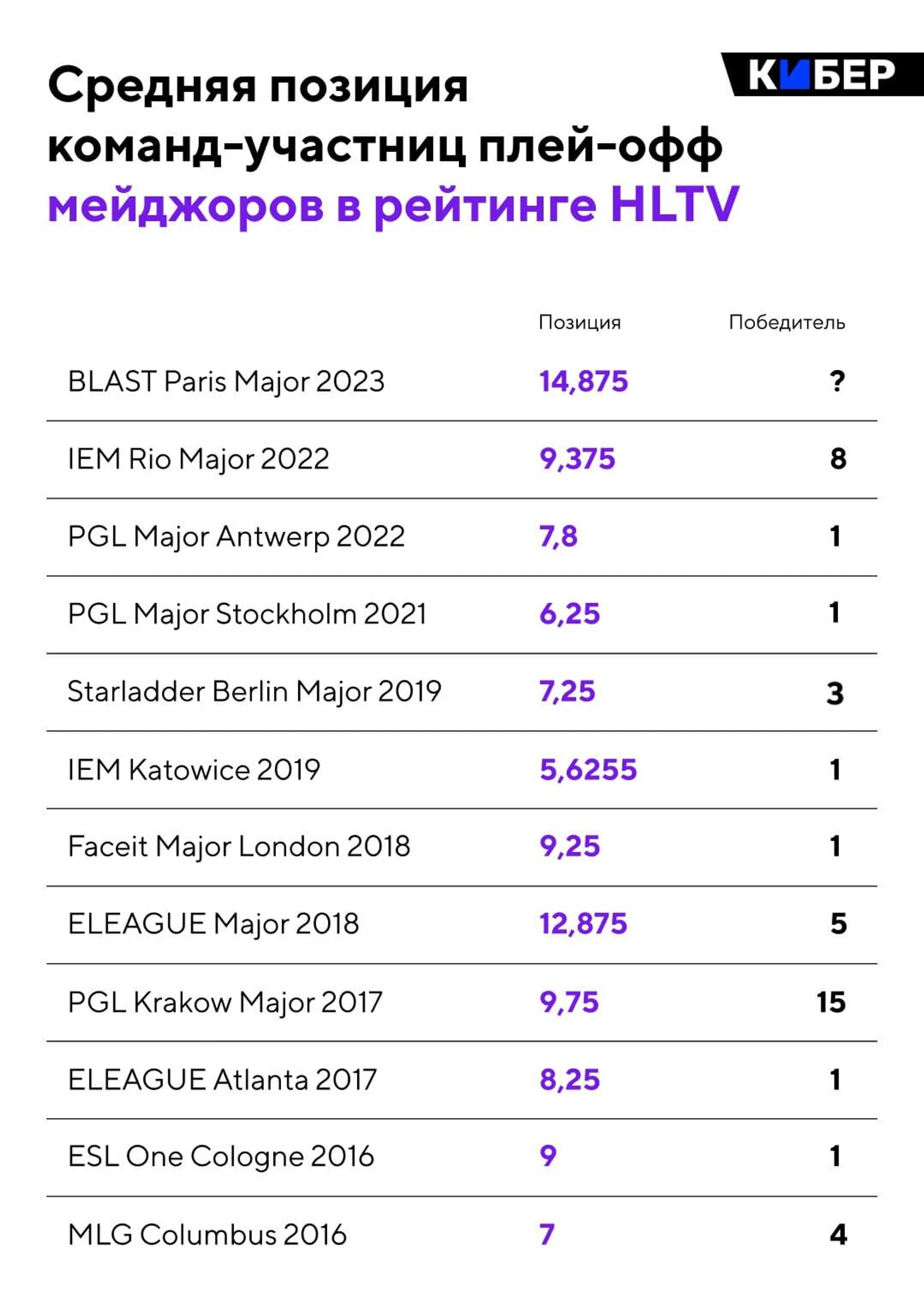 На мейджоре в Париже в плей-офф вышли совсем неожиданные команды – Into The Breach, Gamer Legion, Apeks и Monte – сразу 4 крупные сенсации. В сообществе сразу начали проводить аналогии с Краковом, где в финале тоже играли две команды второго эшелона. Мы сравнили все мейджоры с 2016 года, чтобы выяснить, на каком из них была самая низкая средняя позиция команд в рейтинге HLTV. Данные взяли с недели, предшествующей мейджору, чтобы очки за стадию «претендентов» не учитывались в подсчете.