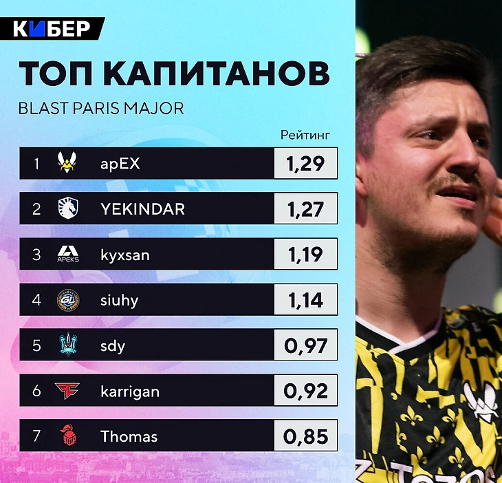 • Екиндар в роли капитана снова дал команде много импакта. Он второй в рейтинге (1,27), выше – только Apex, выигравший турнир.
