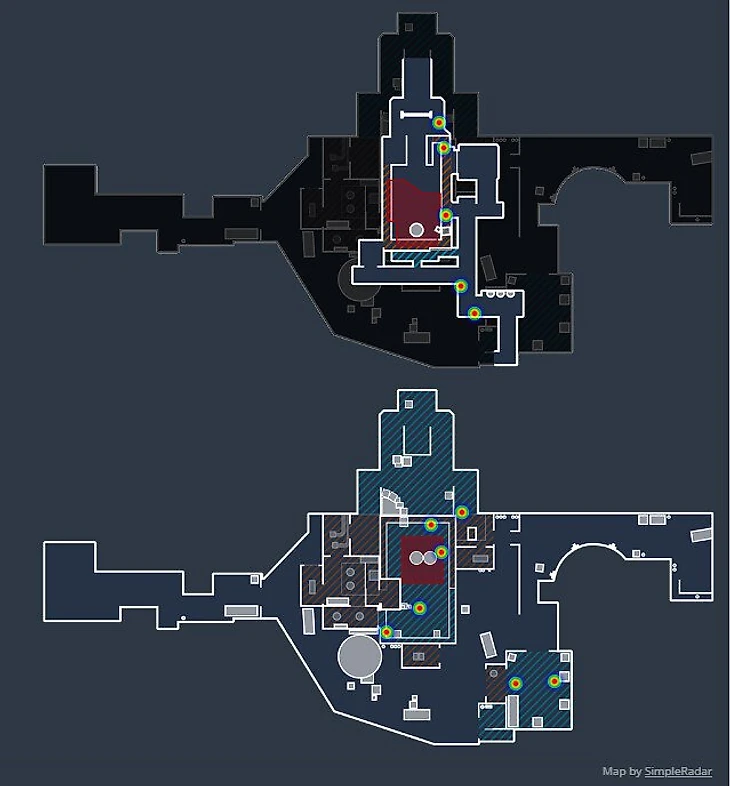 Очень интересно разбираться в стиле Zywoo. В стартовом матче против G2 он играет как классический снайпер на Нюке – работает в районе девятки, из-за чего держит под контролем почти всю карту: рампу, улицу, точку А. При необходимости быстро оказывается под Б. Да и в атаке он при первой же возможности берет AWP, ходит с ней на улицу, играет как любой другой снайпер. И вполне ожидаемый итог: 12 фрагов с AWP из 30. На карте показаны позиции, в которых Zywoo находил противников.