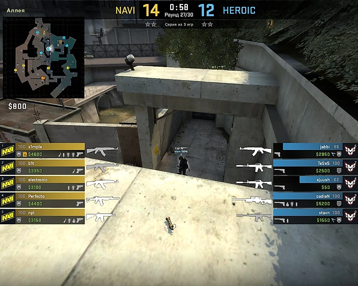 Вернемся к раунду Кэдиана. Его маневр с дропом флэшек на нижний плент небезопасен. Граната может застрять в листве или упасть не к тиммейту, а на крышу. Кэдиан-то кидал две флэшки, а долетела только одна. Вторая не докатилась и осталась одиноко лежать в недосягаемой зоне – минус 200 баксов.