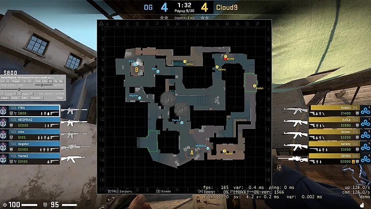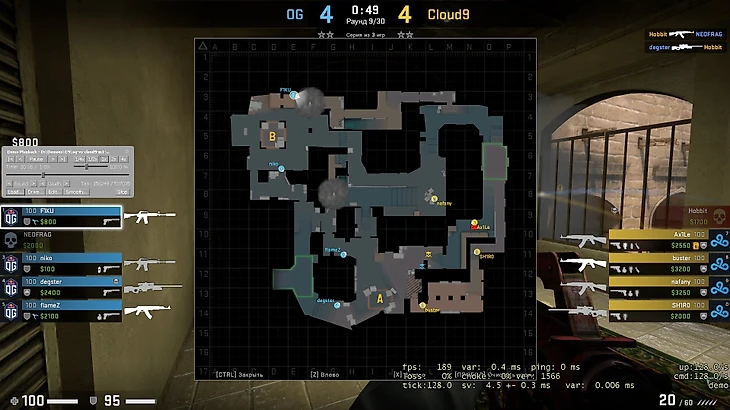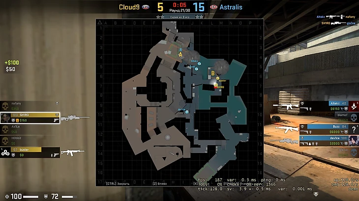 Проходит еще минута. Нафаня занял мид, но он не поможет команде, потому что слишком далеко. Бустер всю минуту просидел в паласах, остальные игроки почти без информации выходят на точку. Раунд выигрывается, но лишь за счет сильной стрельбы. А ведь Аксиль и Нафаня могли вместе зайти через коннектор, Хоббит мог дождаться тиммейта и лишь потом выходить на плент. Небольшое изменение тактики дало бы намного больше контроля за картой.