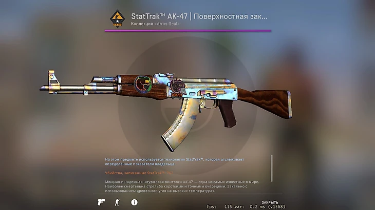 AK-47 «Поверхностная закалка» – популярный скин, хоть и вышел в 2014 году. Ценятся экземпляры, полностью покрытые голубым следом. У Неймара намного более частый паттерн, но он все равно стоит не меньше ста тысяч рублей.