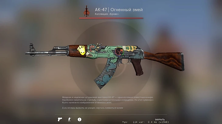 AK-47 «Огненный змей» вышел еще в 2013 году и был первым редким скином на главную пушку в игре. У Неймара автомат в качестве «немного поношенное» за 170 тысяч рублей, еще 100 тысяч стоит золотая наклейка «Корона» – вторая по стоимости в игре.