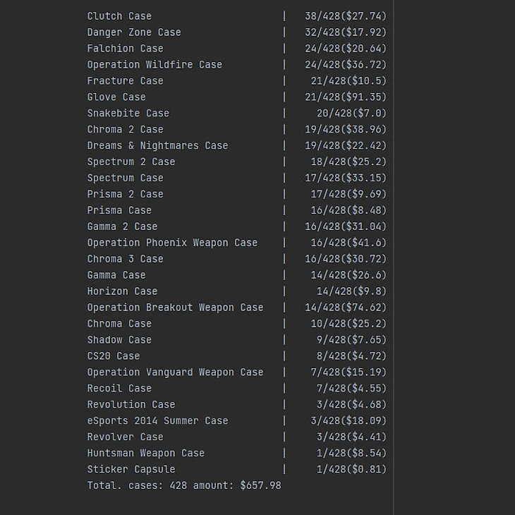 За 9 лет игры программисту выпало 428 кейсов. Судя по всему, он играет в CS очень активно – почти каждую неделю забирал по одному контейнеру. Однажды ему даже выпала капсула с наклейками, для которой также требовалось покупать ключ. Если бы он хранил все предметы до 2023 года, то смог бы продать их за 700 долларов – почти 60 тысяч рублей (на скриншоте указана меньшая сумма, так как данные взяты в январе).