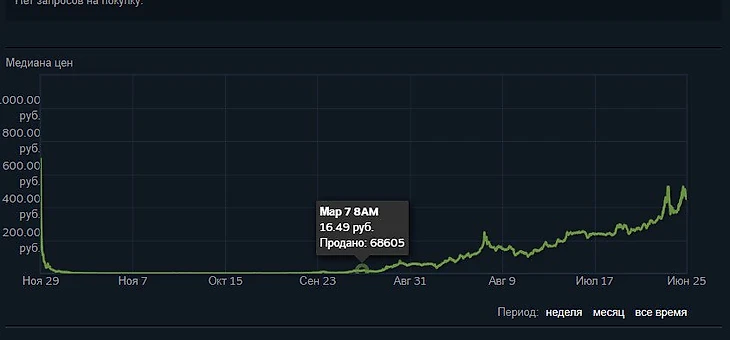 Но уже к зиме 2022 года рост продолжился. Разработчики просто не добавляли новые кейсы, поэтому рынок не мог встряхнуться и перезагрузиться. В 2021 году вышел только «Змеиный укус», в 2022 году – «Грезы и кошмары» и «Гремучий», в 2023 году – «Революция». А поскольку вышло лишь 4 контейнера за три года, цены быстро росли: «Призма 2» за 2022 год подорожала с 3 до 15 рублей, «Змеиный укус» из активного дропа – с 5 до 11 рублей.