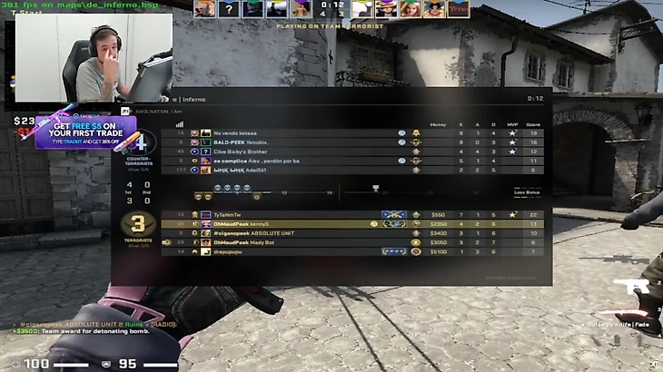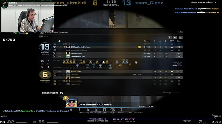 Француз также шутил над своим баном – на один день он пошел в матчмейкинг, где играл вместе со своими друзьями. У него был глобал, а у тиммейтов – 4 звезды и два калаша. Кенни говорил, что через день легко вернется на фейсит, и этот бан ему никак не мешает, причем между слов он постоянно смеялся.