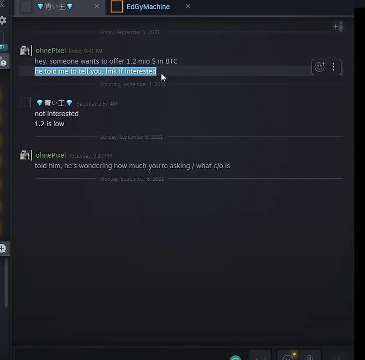 Объективно оценить скин сейчас очень сложно. В сентябре 2021 года популярный ютубер Ohnepixel рассказывал, что его знакомый пытался купить такой скин за $1,2 миллиона в биткоинах, но владелец отказался: посчитал, что это слишком дешево. По другим оценкам, стоимость скина уже может достигать двух миллионов долларов.