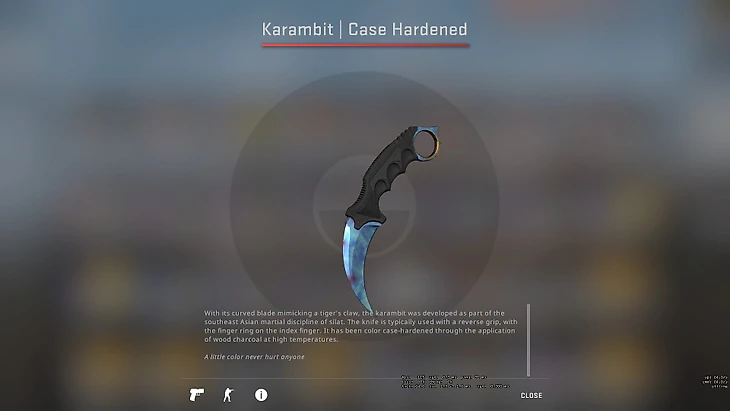 Вероятность выбить такой в качестве «прямо с завода» ничтожно мала: шанс на нож при открытии кейса – 0,26%, затем вам должен выпасть конкретный нож с шансом 1 к 64. Наконец, вам должен выпасть один конкретный паттерн из 999 доступных. Итоговый шанс: 0,00000040625%.