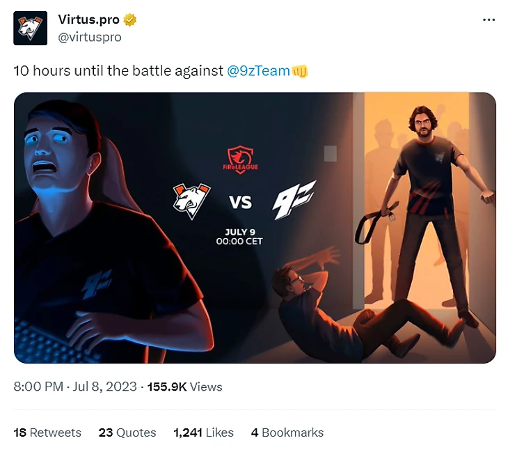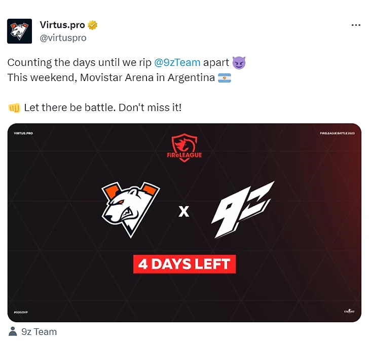 Все началось с поста VP: «Считаем дни до возможности разорвать 9z. Уже в эти выходные мы будем сражаться на Movistar Arena в Аргентине. Вас ждет жаркая заруба. Не пропустите!»