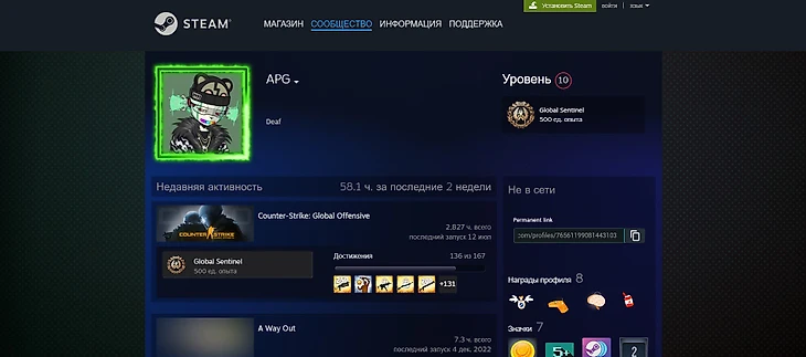 Глухой игрок провел в CS почти 3 тысячи часов, у него 44 матча на FaceIt на втором уровне. В профиле много положительных комментариев, игроки постоянно хвалят APG, отмечая, что он круто играет. Конечно же, много и простых «+rep».