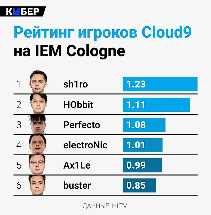 Но пока – на дебютном турнире в Кельне – статус звезды на постоянной основе подтверждал только Широ. Cloud9 сыграла пять матчей и только раз на первом месте был не снайпер команды. Да, по статистике Широ далеко впереди: рейтинг HLTV – 1,23. На удивление, второй – Hobbit, которого явно не рассматривали на роль главного рифлера. А Аксиль, который подъехал только к плей-офф, сыграл в минус. Что в его ситуации, в целом, понятно.