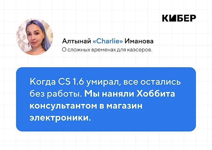 Кстати, прикольный момент был: когда CS 1.6 умирал, все остались без работы. Я зашла в агентство, и я помню, что наняли Хоббита на работу консультантом.