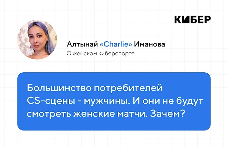 Поэтому, когда я сейчас вижу, что есть молодые, которые могут играть, стримить и зарабатывать на этом, это очень круто. Понятно, что по масштабам все равно это будет очень далеко, и я понимаю причины. Люди приходят посмотреть на зрелищность и на скилл. Большинство потребителей CS-сцены – мужчины. И они не будут смотреть женские матчи. Потому что, ну, зачем?