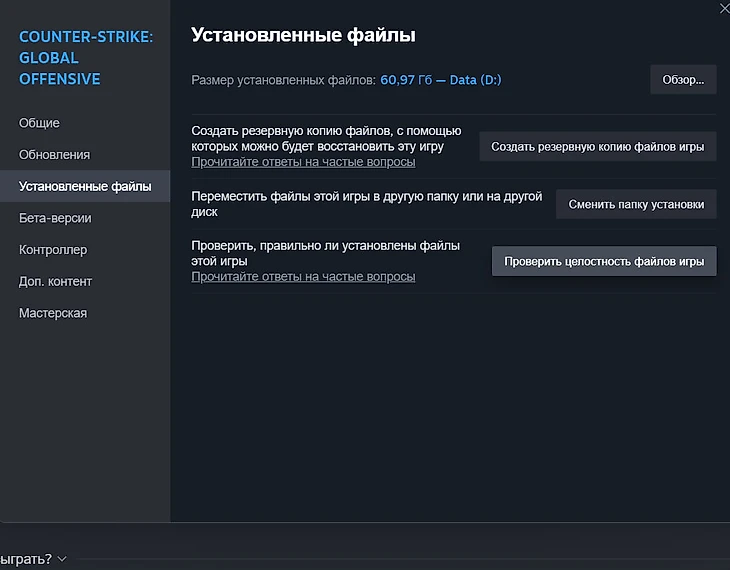 Наконец, можно попробовать проверить целостность файлов игры. Откройте свойства CS:GO в Steam, найдите вкладку «Установленные файлы» и нажмите на кнопку «Проверить целостность файлов». После проверки игра может снова скачать часть файлов, после чего попробуйте зайти в нее.