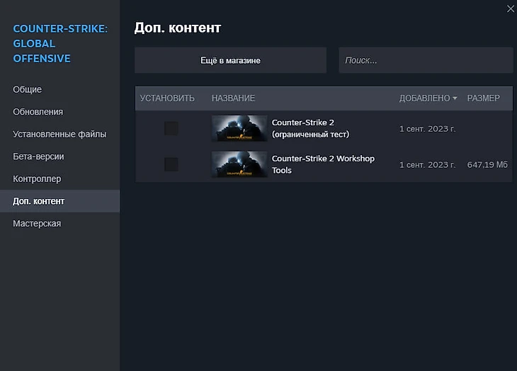 CS:GO останется в вашей библиотеке. Перед установкой игры снова нажмите по названию игры правой кнопкой. Выберите «Свойства», затем – «Доп.контент». Уберите галочки напротив Counter-Strike 2 (ограниченный тест) и Counter-Strike 2 Workshop Tools.