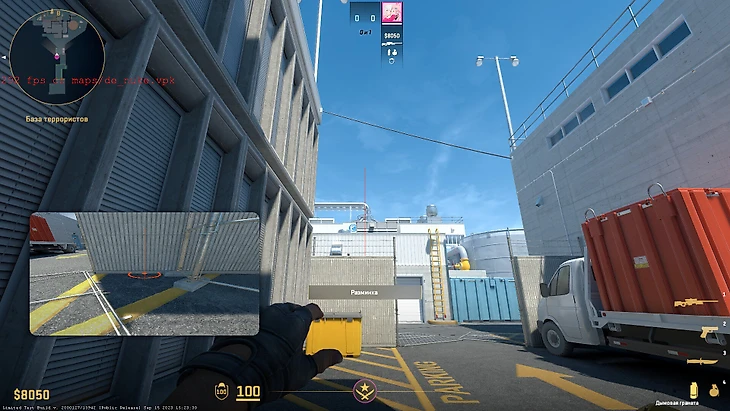 Если игрок защиты хочет поджать улицу, то должен дать простой дым, чтобы закрыть от противников красный ящик. Прицельтесь в угол небольшой синей коробки, гранату бросайте на бегу.