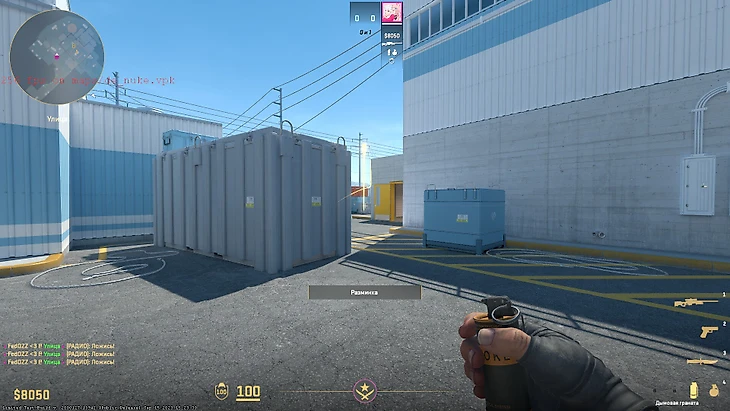 Все основные дымы на Nuke – на улице. Для смока между красным и синим ящиком бегите по краю тени и кидайте в место, где соединяются две части забора.