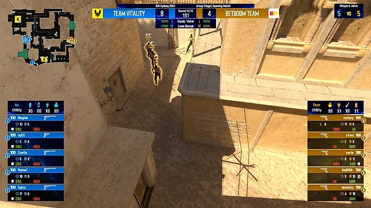 Главная инновация команды Нафани – отказ от закупки на пистолетке в атаке. На Мираже против Vitality Nafany покупает P250, смок и флэшку. Пистолет передает Zorte, который докупает себе армор. Три игрока ничего не покупают. Команда быстро выбегает на точку А, дым закрывает коннектор, основная задача – поставить бомбу.