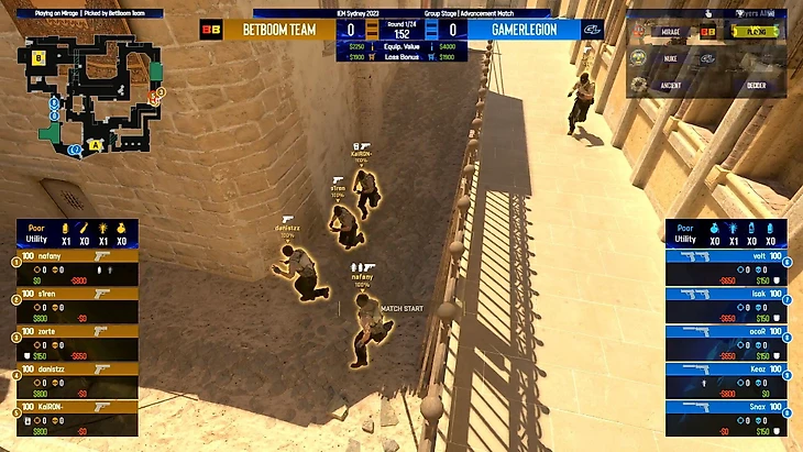 На других картах BetBoom Team и вовсе играла лишь с гранатами Нафани, 4 игрока не закупались, ни у кого не было брони. Команда проигрывала пистолетки, зато выигрывала форс-раунды. Хотя закупку из Галилов и AK-47 очень сложно назвать форсом.