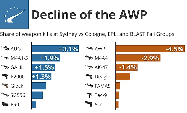 Поэтому в моде другие пушки. На HLTV выяснили, что в Сиднее, по сравнению с тремя последними топ-ланами в CS:GO, чаще берут и убивают с SG и Aug. Обычно так делают снайперы, потому что контролировать позицию с этими пушками легче, чем с AWP, а количество киллов со снайперки снизилось на 4,5%.