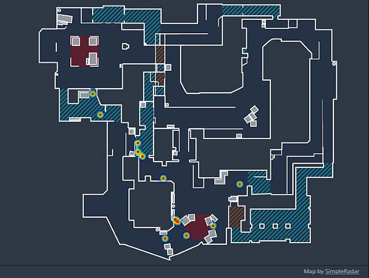 В защите Игорь играет с минимумом агрессии, лишь изредка может удивить противников, например, запрыгнуть на шорт с окна на Мираже. Намного чаще он играет на стандартных позициях. На картинке ниже – карта его фрагов с последнего Mirage за Sprout, почти все фраги сделаны в джангле или КТ – самых обычных позициях для снайпера.