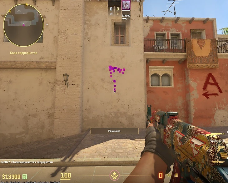 Замечаем минимальную разницу, которую можно списать на погрешность, – все-таки повторить движение мышкой один в один невозможно. Но обращаем внимание на фиолетовые точки на стене – они отвечают за регистрацию на сервере (розовые – выстрелы на стороне клиента). На первых двух скриншотах они идеально совпадают, на последних двух – отличаются.