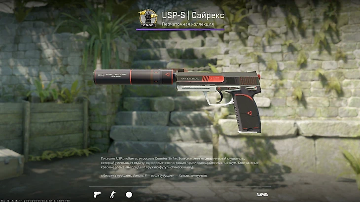 «Сайрекс» – популярная серия скинов, которая стала известной из-за M4A1-S. Но Эмка в качестве «прямо с завода» стоит 3 тысячи рублей, а USP-S – всего 300. Среди конкурентов у пистолета лишь «Закрученный» и «Неисправность», оба проигрывают «Сайрексу» как в популярности, так и в красоте скина – на первом слишком мало контрастных элементов, а на втором цвет вышел слишком грязным.