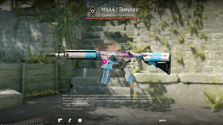 M4A4 из самого свежего кейса стоит всего тысячу рублей за «закаленное в боях» – на скине появляется много потертостей, но основной рисунок все еще виден. Скин отлично подойдет фанатам аниме и AUG «Акихабара» – яркого и красивого скина, который стоит больше 500 тысяч рублей. За намного меньшую сумму вы получите похожую аниме-героиню, надписи и цвета. Версия «после полевых испытаний» стоит на тысячу рублей дороже, но на ней намного меньше потертых элементов, а скин выглядит ярче.