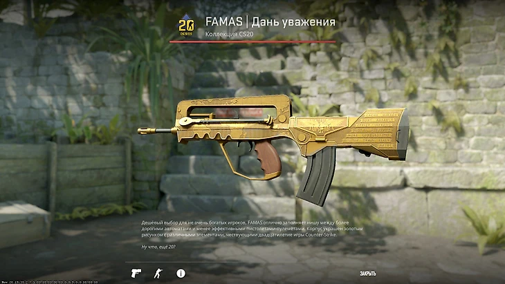 Хотите золотой AK-47, но нет лишних 360 тысяч рублей? Отличная альтернатива – золотой Famas за тысячу рублей. В отличие от других скинов, на нем есть деревянная ручка, а на задней части выгравированы названия ключевых карт в истории CS:GO – есть и Mirage, и Dust 2, и Inferno, и уже давно удаленные карты – Cobblestone и Aztec. Версия «прямо с завода» будет на тысячу дороже – она отличается от самой дешевой лишь яркостью скина, а дефектов практически нет.
