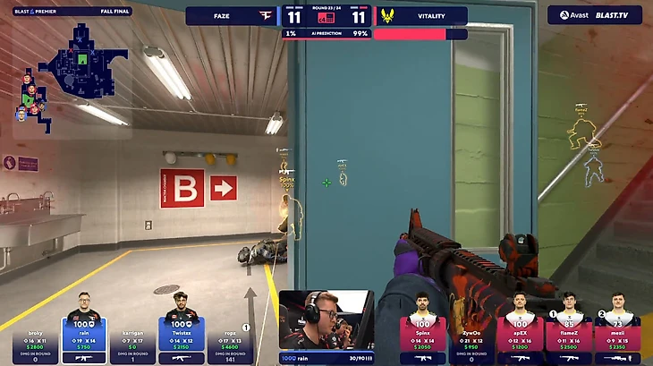 Вторая карта финала Бласта между Faze и Vitality. Счет – 11:11. У французской команды эко, но у Зайву появляется АК-47, тогда как у остальных лишь Глоки. Отдать топ-игроку девайс в таком раунде – распространенная практика, правда, шансов выиграть все равно крайне мало.