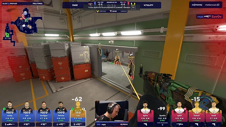 Ропза мгновенно затыкали Глоки. 4 в 4. Броки прибежал хелповать, но промазал и не стал далеко уходить. Это ключевой момент раунда. Латвиец зажался в угол, а его запушил Mezii, который резко выпрыгнул и забрал снайпера Faze. 4 в 3, плюс AWP у Vitality.