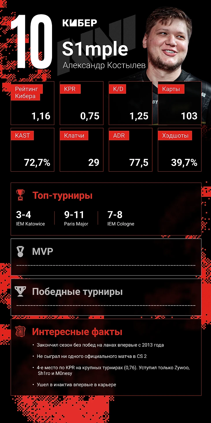 • Раннее завершение сезона. Из-за ухода в отпуск Симпл пропустил два важных финальных турнира – осенний и итоговый финал Blast, из-за чего к нему остаются вопросы. Как бы он адаптировался к CS 2? А сыграли ли бы NAVI лучше? Вытекающий минус: малое количество сыгранных карт – всего 103, что меньше, чем у большинства других участников рейтинга.