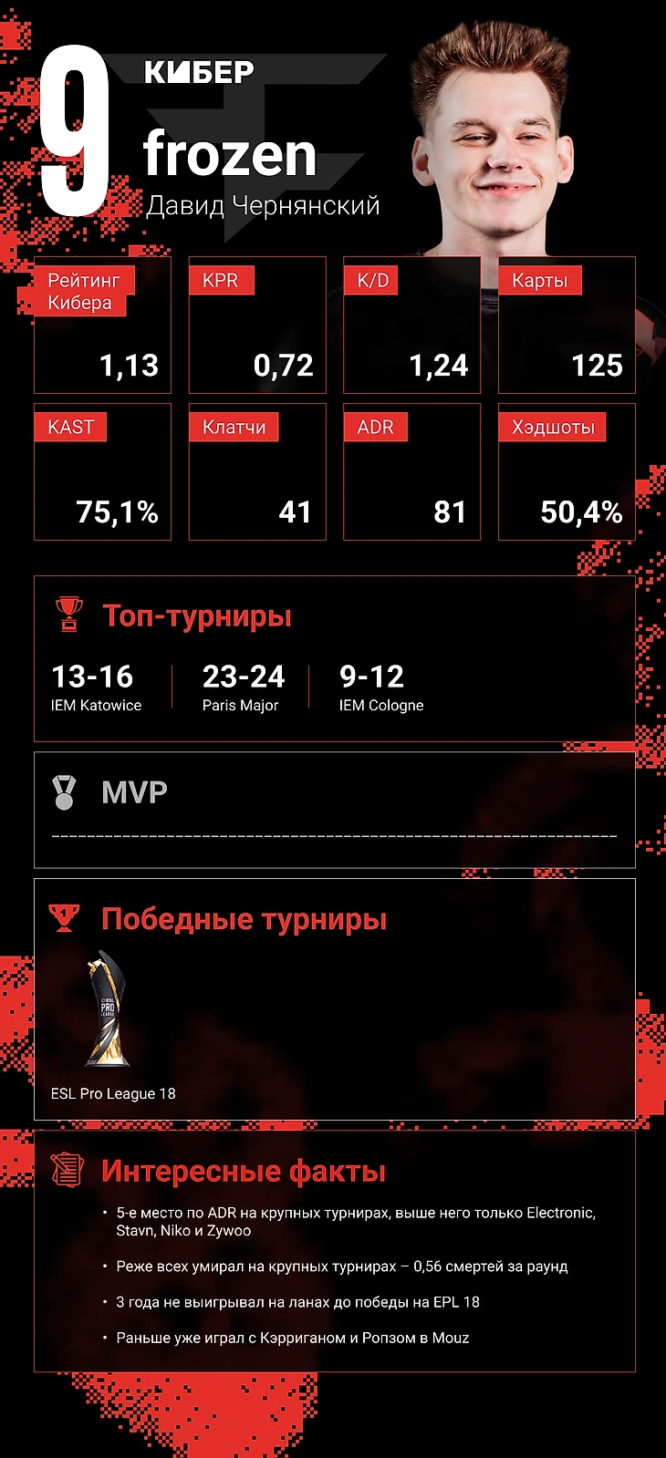 Стабильность и попадание в топ-10 турниров на регулярной основе с учетом победы на ESL Pro League 18 обеспечили Фрозену девятое место.