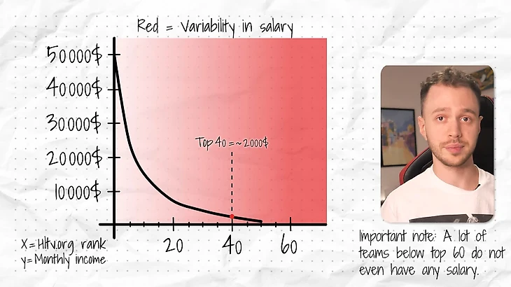 Отдельно он показал приблизительный график зарплат: в топ-40 команде игроки получают около двух тысяч долларов, в топ-5 – $25 тысяч, у большинства составов вне топ-60 зарплаты нет.