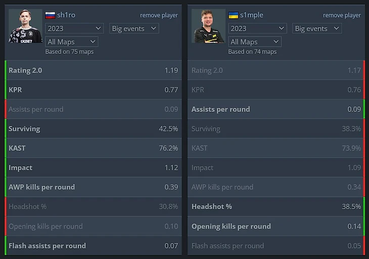 Симпл лучше только по оупен-киллам за раунд и по нерелевантному для снайперов проценту хэдшотов. В семи оставшихся показателях из восьми Широ выигрывает, еще в одном равенство.