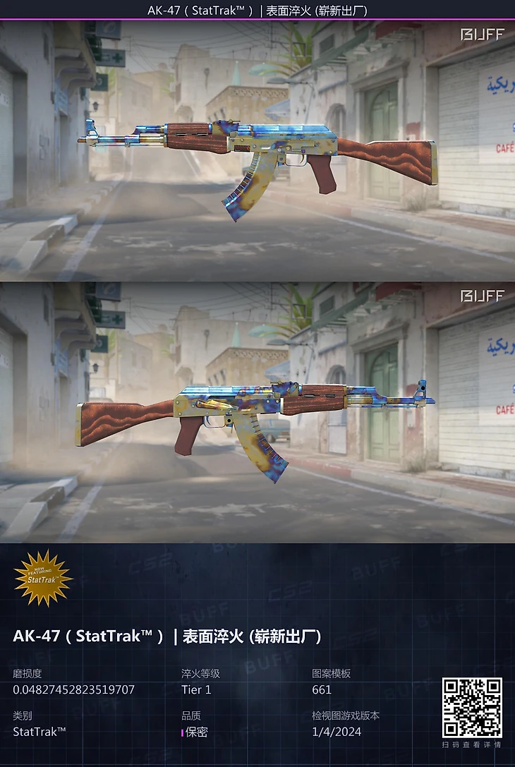 Лишь 4 января 2024 года китайский игрок получил StatTrak AK-47 «Поверхностная закалка» в качестве «Прямо с завода» с самым ценным паттерном 661. Предположительно, он скрафтил его в контракте обмена. Главный эксперт по скинам – стример Ohnepixel – не сразу поверил, что такой AK-47 наконец-то появился, а чуть позже оценил его в $1 миллион. Дороже – лишь Керамбит «Поверхностная закалка» в паттерне Blue Gem за $1,5-2 миллиона.