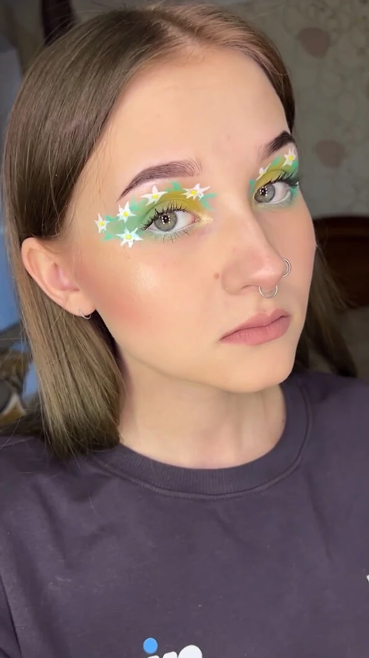 Так, взяла зубную пасту и фломастер. Опять ####### [делает] что-то с глазом. Замазкой ###### [мажет] себе под бровью. Короче, дальше ###### [рисует] она фломастером лепестки. ###### [Рисует] она все, короче, замазкой с фломастером. Уже ######## [пол-лица] разукрашено.