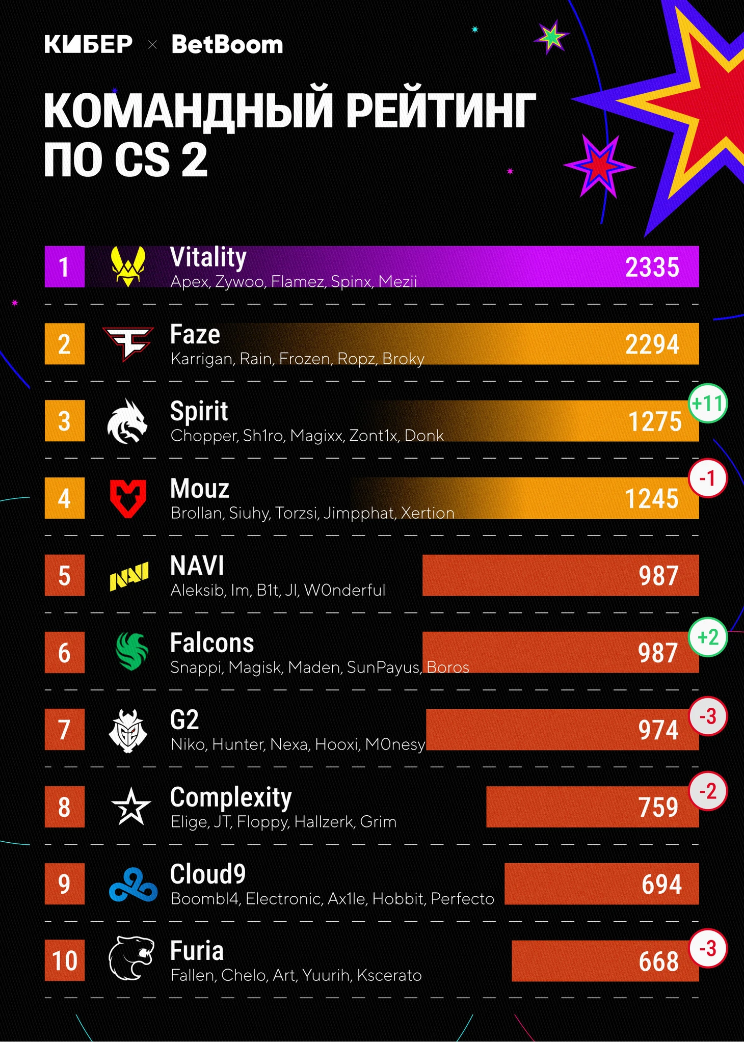Командный рейтинг Кибера по CS после IEM Katowice! Spirit в топ-3, появились новички