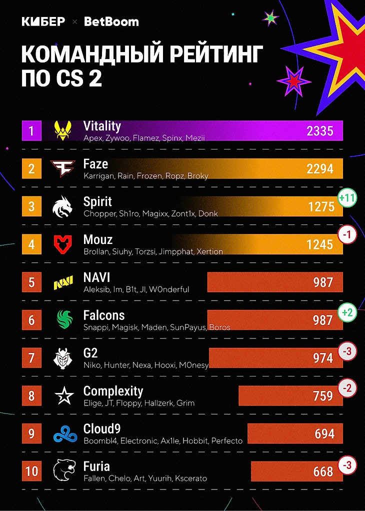 Закончился IEM Katowice 2024 – Spirit заняла первое место, из-за чего сразу ворвалась в топ-3 командного рейтинга Кибера. Но Vitality и Faze все еще на троне с большим отрывом – скинуть их будет довольно сложно. Остальные изменения смотрите на картинках и не забывайте, что у наших партнеров из BetBoom доступна бесплатная ставка в 1000 рублей для новых пользователей.