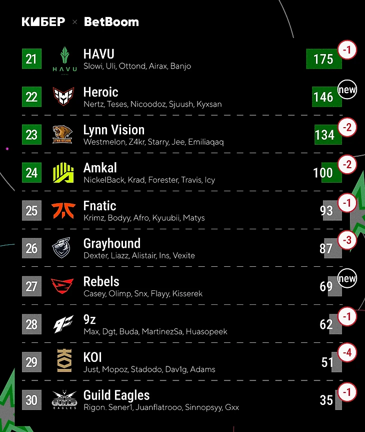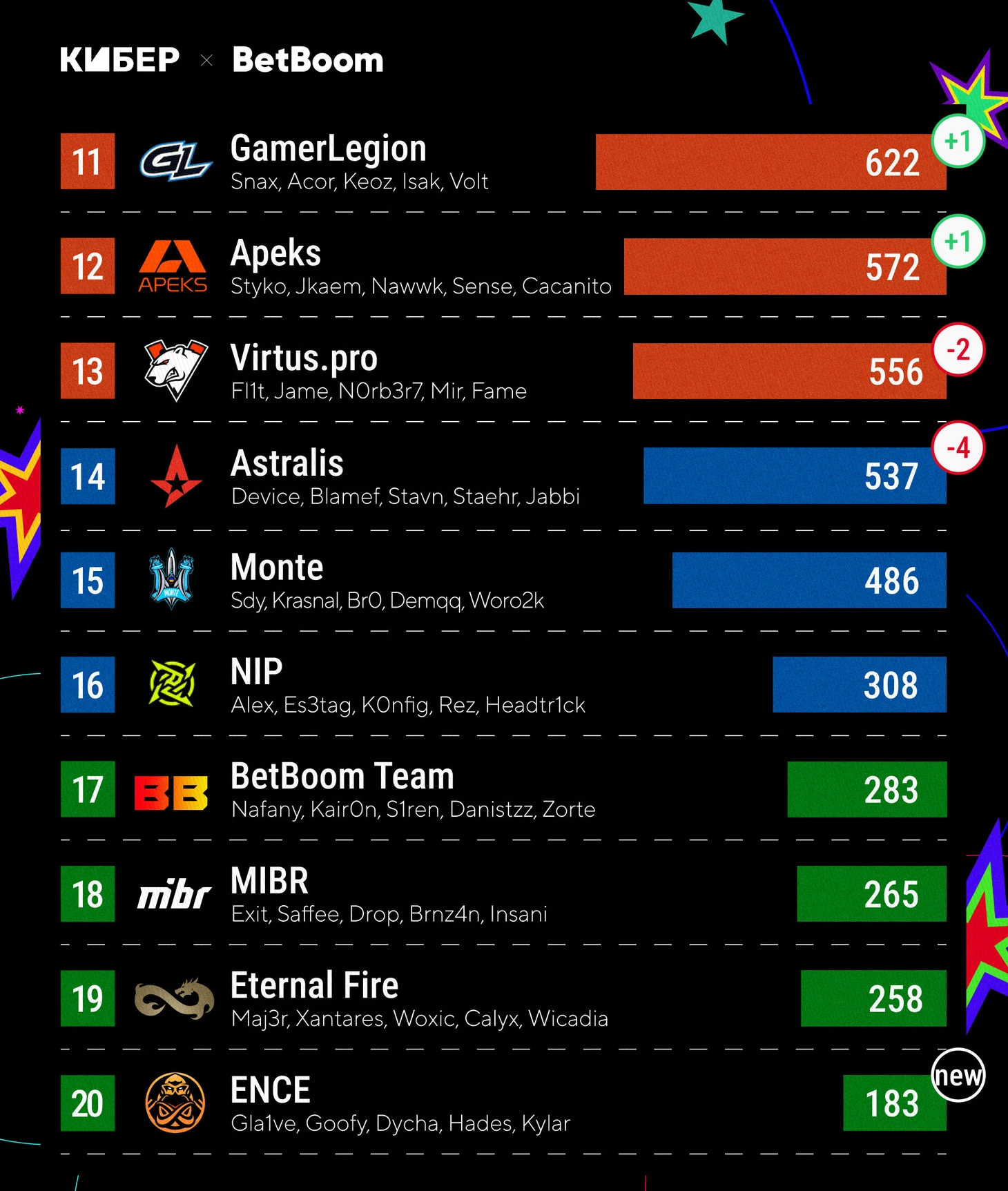 • G2 потеряла очки за прошлый IEM Katowice, из-за чего новых баллов за выход в плей-офф ей не хватило – команда упала на три позиции. Но ничего страшного нет – отрыв от NAVI и Falcons минимален, клуб может вернуться в пятерку уже после следующего турнира.