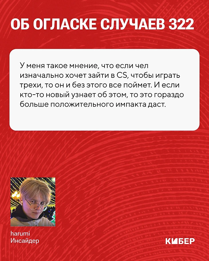 Был же момент, когда ESIC выложили твит, в котором предупреждали, что если вам пишет человек с ником DEzCurse, то он предлагает 322. Я тогда тоже сделал пост, в котором предупредил, что с ним лучше не иметь дел для своей же безопасности. И многие спрашивают: «А зачем вообще такое пиарить?» У меня такое мнение, что если чел изначально хочет зайти в CS, чтобы играть трехи, то он и без этого все поймет. И если кто-то новый узнает об этом, то это гораздо больше положительного импакта даст. Начнутся баны таких команд на букмекерских конторах и так далее.