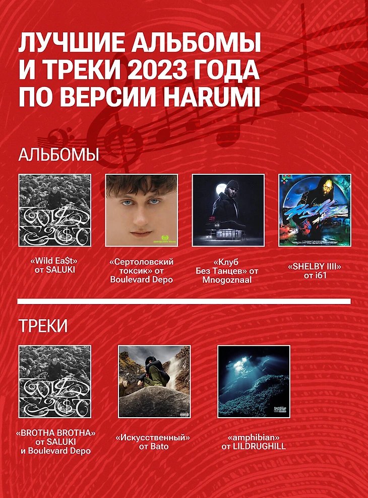 – Я назову три трека и три альбома. Топ-1 альбом это «Wild Ea$t» от SALUKI, это вообще космос. Ну, еще альбом Boulevard Depo, наверное. Мне понравилось, потому что я все от него слушаю и все добавляю. Некоторым тоже зайдет, там прямо больше экспериментов. А вот с третьим сложно. Я очень мало чего добавил к себе за 2023 год, очень мало что понравилось. Третье место я разделю – сюда войдет альбом от Mnogoznaal «Клуб Без Танцев» и альбом от i61 «SHELBY IIII». Но последний будет сложно понять, если ты не слушал три предыдущие части.