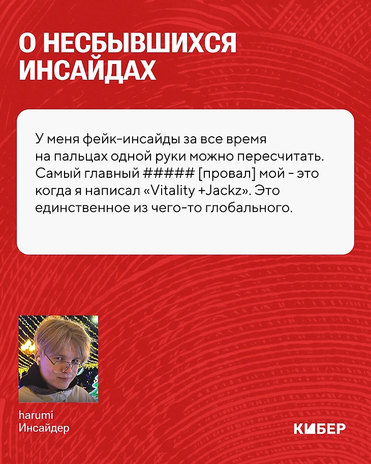 – Я согласен с тем, что сказал Овер, но у меня фейк-инсайды за все время на пальцах одной руки можно пересчитать. Самый главный ##### [провал] мой – это когда я написал «Vitality +Jackz». Это единственное из чего-то глобального, что не было даже близко к произошедшему. Тогда просто Джекса спросили «Го в Vitality?». Он такой: «Не». И все. Нет такого, что я не проверяю информацию, просто я иногда могу не сделать дабл-чекинг. Не могу из двух моментов проверить.