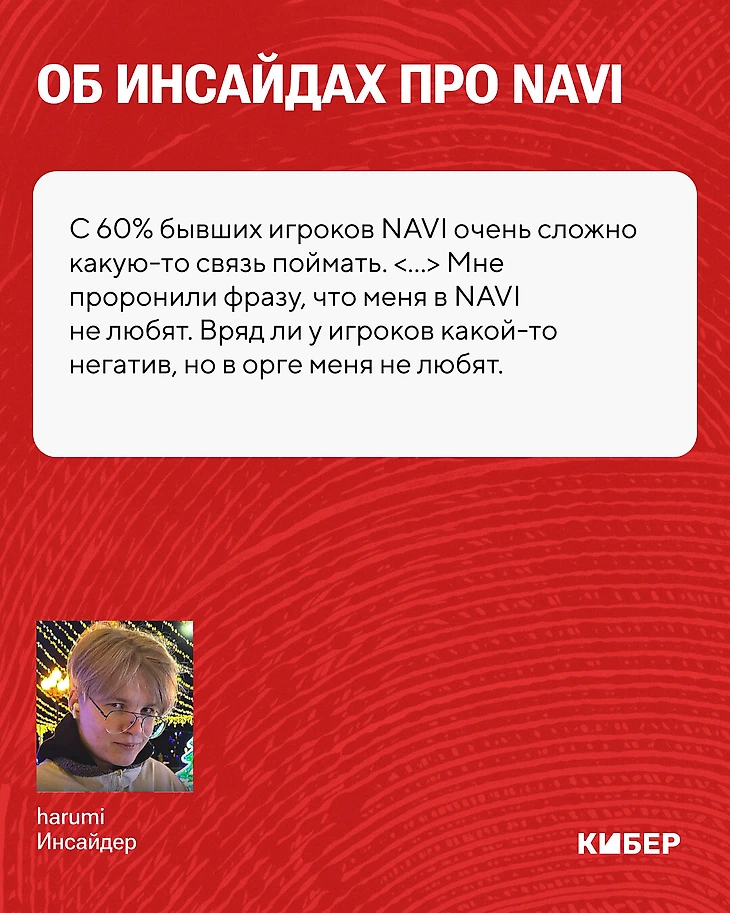 – Да и просто в общении. Потому что у них как-то все очень закрыто и сложно. То есть у меня никогда не было близкого общения с человеком из NAVI, но в то же время я могу что-то Бумычу написать. С jL пару раз перекидывались словами. Но чтобы было регулярное общение – нет. Мне проронили фразу, что меня в NAVI не любят. Вряд ли у игроков какой-то негатив, но в орге меня не любят.
