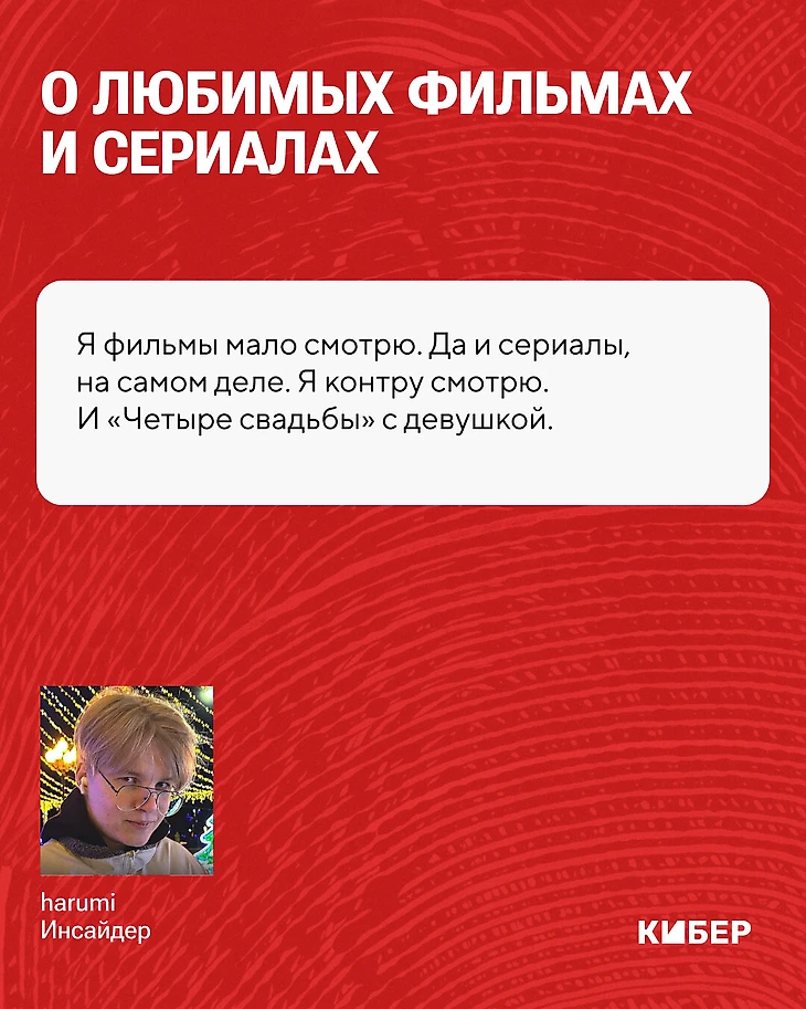 – Я фильмы мало смотрю. Да и сериалы, на самом деле. Я Контру смотрю. И «Четыре свадьбы» с девушкой. Любимый сериал из тех, что я смотрел, это «Вампиры средней полосы». Я его просто одним глотком выпил. Мне очень понравилось. А вообще я больше по музыке.