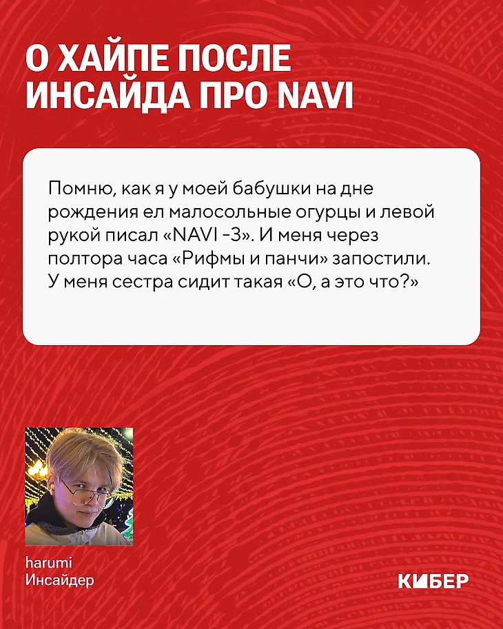 Еще было интересно, когда я писал про VP и Spirit. Они тогда в один момент убрали Кайрона, а Spirit убрала Патси, Сирень и Вандерфула. И я до последнего писал о каждом тестовом составе Spirit и VP. Тогда у меня нафармилось тоже подписчиков нормально. Но самый хайп, конечно, был с NAVI, когда я про их решаффл запостил. Помню, как я у моей бабушки на дне рождения ел малосольные огурцы и левой рукой писал «NAVI -3». И меня через полтора часа «Рифмы и Панчи» запостили. У меня сестра сидит такая «О, а это что?»