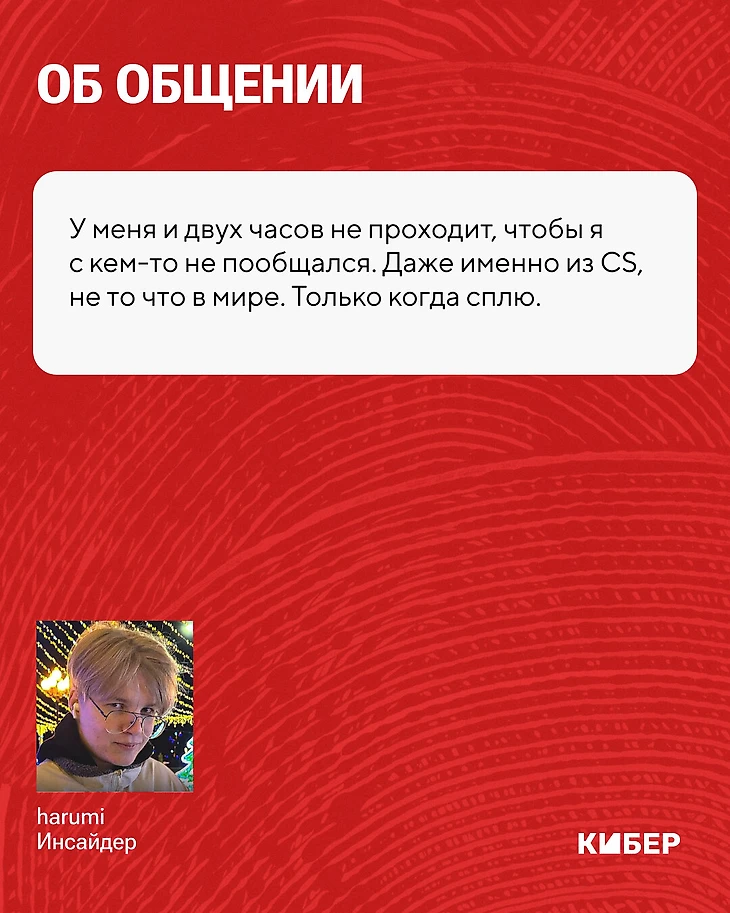 – У меня и двух часов не проходит, чтобы я с кем-то не пообщался. Даже именно из CS, не то что в мире. Только когда сплю. Наверное, сейчас такой проблемы нет, но если этого прямо много, то я могу банально не отвечать человеку сутки в ТГ. Просто потому что сообщений много. Такого, чтобы я прямо выматывался, пока что нет, но это в какой-то момент может произойти. Условно ты три месяца живешь по дефолту, а потом в какой-то момент по щелчку за день тебя как будто отключает – и просто сил нет. Вот такое бывает, да.